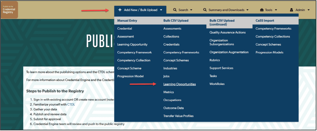 STEP 1: Log in to the Credential Publisher and navigate to the “Add New/Bulk Upload” menu. Select “Learning Opportunities” from the Bulk CSV Upload column.